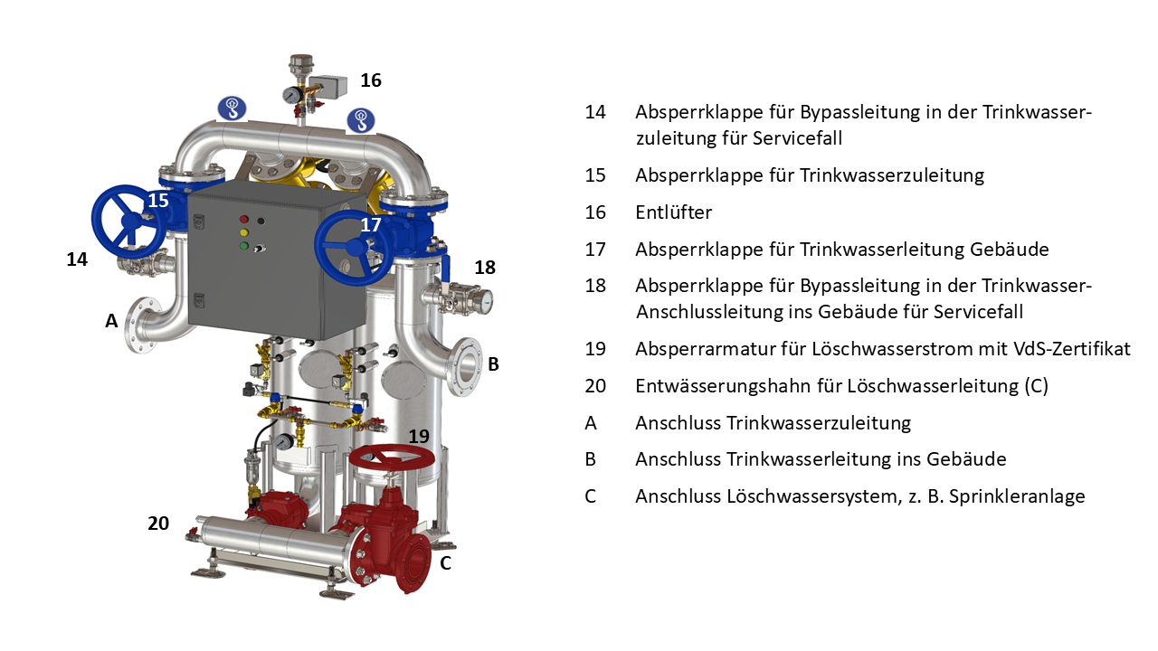 Die Anforderungen zur Brandbekämpfung (Wasser zum Löschen) werden zweikanalig auch bei komplettem Ausfall der hygienischen Trennung, der Steuerung und der Energieversorgung voll erfüllt.