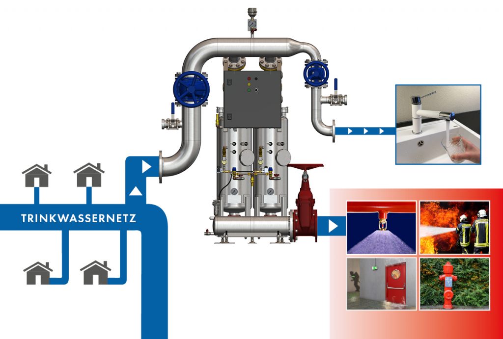 Trinkwasserhygiene für den Brandschutz, wie z. B. Löschwasserversorgung von Außenhydranten und Sprinkleranlagen bis 192 m³/h
